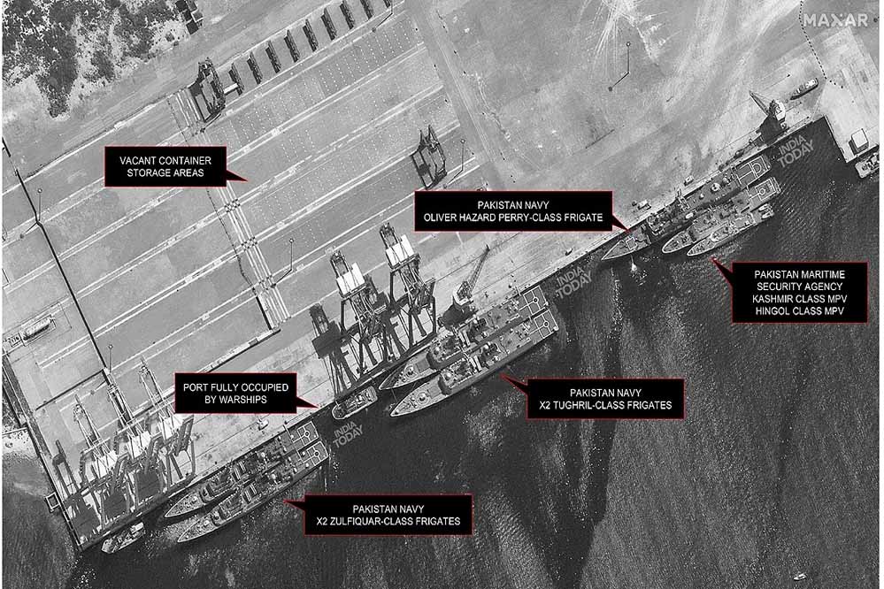 8 मई की कराची बंदरगाह की सैटेलाइट तस्वीर बताती है कि पाक नौसेना के युद्धपोत व्यावसायिक बंदरगाह और कंटेनर टर्मिनल पर खड़े थे.