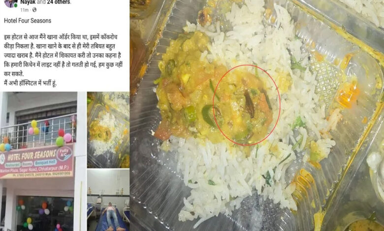 दरअसल, पूरा मामला छतरपुर के सीताराम कॉलोनी का है। यहां के रहने वाले एक शख्स राहुल बिंदुआ ने होटल के खाने मे कॉकरोच होने की बात कही। वहीं खाने में कॉकरोच निकलने से युवक की हालत बिगड़ गई, जिसके बाद उसे जिला अस्पताल में भर्ती कराया गया। सीताराम कॉलोनी निवासी राहुल बिंदुआ ने बताया कि उसने सागर रोड स्थित होटल फोर सीजन से स्विगी के माध्यम से ऑनलाइन खाना ऑर्डर करके मंगवाया था। उसने खाने में मिक्स वेज सब्जी, दाल, चावल, रोटी, रायता, बटर पनीर ऑर्डर किया था।