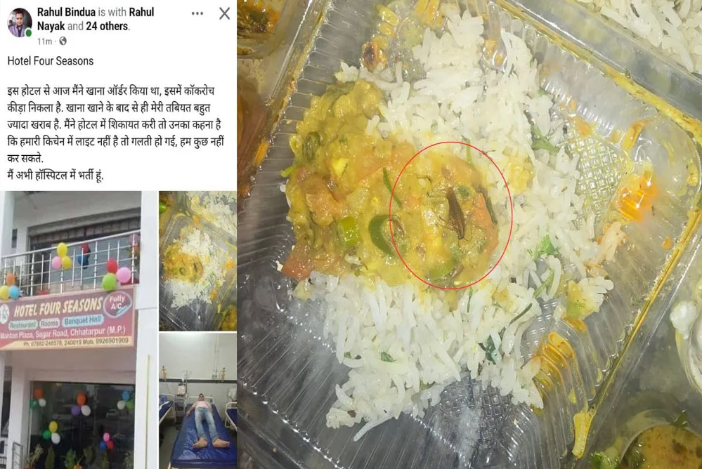दरअसल, पूरा मामला छतरपुर के सीताराम कॉलोनी का है। यहां के रहने वाले एक शख्स राहुल बिंदुआ ने होटल के खाने मे कॉकरोच होने की बात कही। वहीं खाने में कॉकरोच निकलने से युवक की हालत बिगड़ गई, जिसके बाद उसे जिला अस्पताल में भर्ती कराया गया। सीताराम कॉलोनी निवासी राहुल बिंदुआ ने बताया कि उसने सागर रोड स्थित होटल फोर सीजन से स्विगी के माध्यम से ऑनलाइन खाना ऑर्डर करके मंगवाया था। उसने खाने में मिक्स वेज सब्जी, दाल, चावल, रोटी, रायता, बटर पनीर ऑर्डर किया था।
