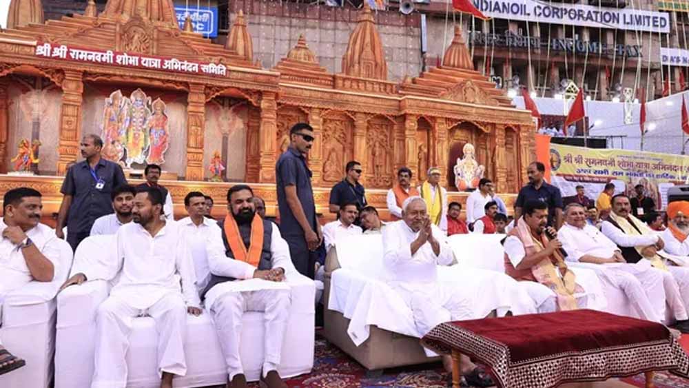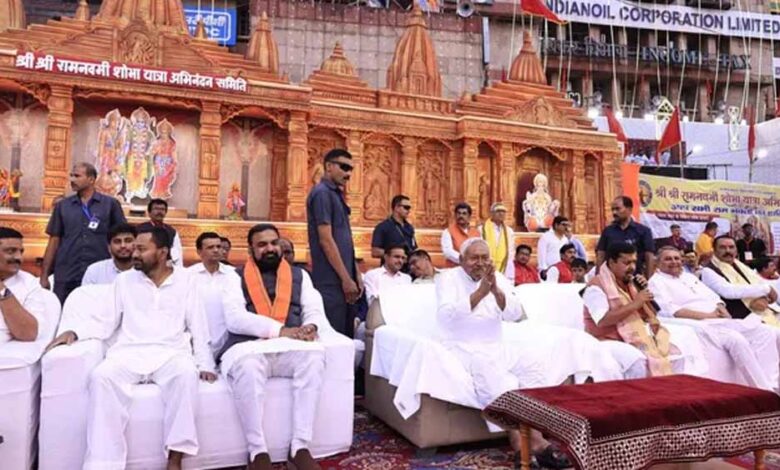 रामनवमी पर डाकबंगला पहुंचे नीतीश कुमार, एक मंच पर दिखे पिता-पुत्र; गूंजे जय श्री राम के नारे
