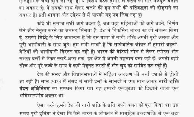पीएम ने कहा कि मैं यह पत्र इसलिए लिख रहा हूं, ताकि हम सभी एक स्वर में इस संशोधन को पारित कराने के लिए एकजुट हों. ज्यादा से ज्यादा सांसद इस विषय पर अपने विचार संसद में रखें. यह अवसर किसी एक पार्टी या व्यक्ति से ऊपर है. यह नारी शक्ति और आने वाली पीढ़ियों के लिए हमारी जिम्मेदारी भी है. हम सभी दल काफी समय से चाहते रहे हैं कि राजनीति में महिलाओं का प्रतिनिधित्व बढ़े. इस आकांक्षा को वास्तविकता में बदलने का यही सही समय है.
