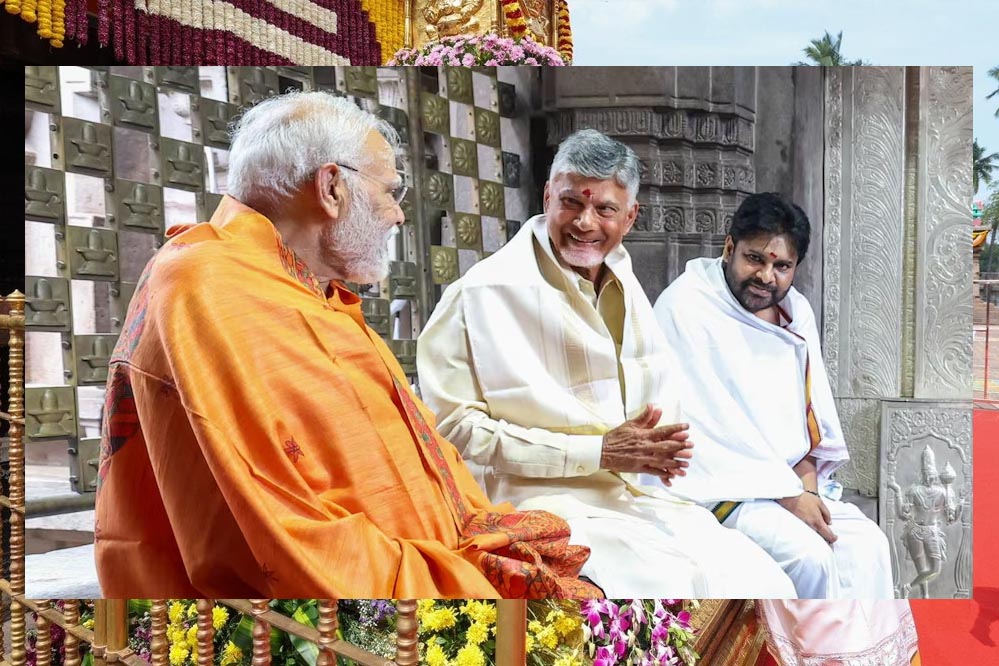 प्रधानमंत्री मोदी की मंदिर से जो तस्वीरें सामने आई हैं, उसमें वह आंध्र प्रदेश के मुख्यमंत्री चंद्रबाबू नायडू और उपमुख्यमंत्री पवन कल्याण के साथ बैठे नज़र आ रहे हैं. तीनों नेताओं का साथ आना केवल धार्मिक भाव-प्रदर्शन नहीं, बल्कि भारतीय राजनीति में कई स्तरों पर बड़े संकेत देती है.