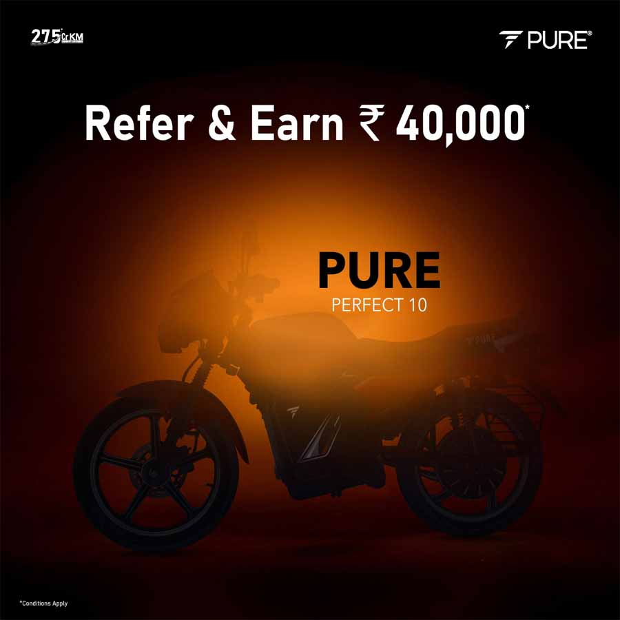 प्योर परफेक्ट 10 रेफरल प्रोग्राम सभी मौजूदा प्योर ईवी ग्राहकों, साथ ही नए ग्राहक जो 31 मार्च, 2025 तक या संबंधित आउटलेट्स पर स्टॉक रहने तक प्योर ईवी वाहन खरीदने वालों के लिए के लिए खुला है। इस योजना के तहत, ग्राहक प्योर ईवी वाहन खरीदने के लिए दोस्तों और परिवार को रेफर करके 40,000 रुपए तक का कैशबैक रिवॉर्ड कमा सकते हैं।