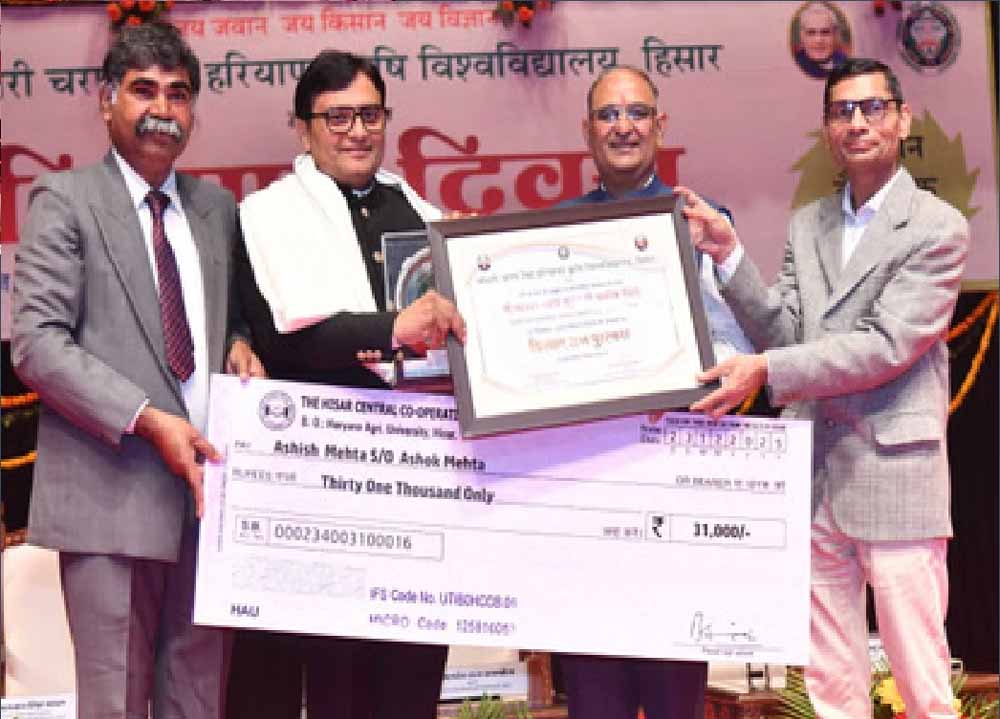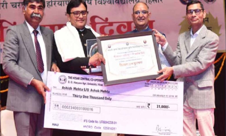 चौधरी चरण सिंह हरियाणा कृषि विश्वविद्यालय में मंगलवार को किसान दिवस पर प्रदेश के 42 प्रगतिशील किसानों को सम्मानित किया गया। समारोह में मुख्य अतिथि एचएयू कुलपति प्रो. बीआर कांबोज ने सिरसा के गांव सुकेरा खेड़ा के आशीष मेहता को किसान रत्न अवॉर्ड से सम्मानित किया। उन्हें स्मृति चिन्ह, प्रमाणपत्र व 31 हजार रुपये पुरस्कार के तौर पर प्रदान किए गए।